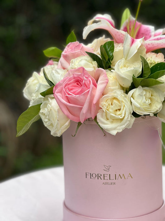 • Mini Box Grecia: Rosas de Jardín y Peonias en tonos rosados (Rosas Inglesas)