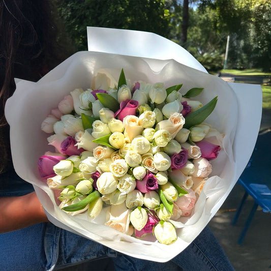 • Ramo Buchón Preciosa 100 Flores: Rosas, Tulipanes y Peonias (Rosas Inglesas) - Flores Moradas