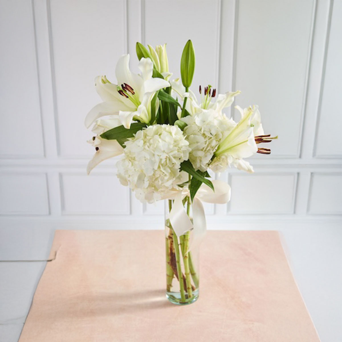 Lirios blancos y hortensias: Un arreglo elegante y sereno.