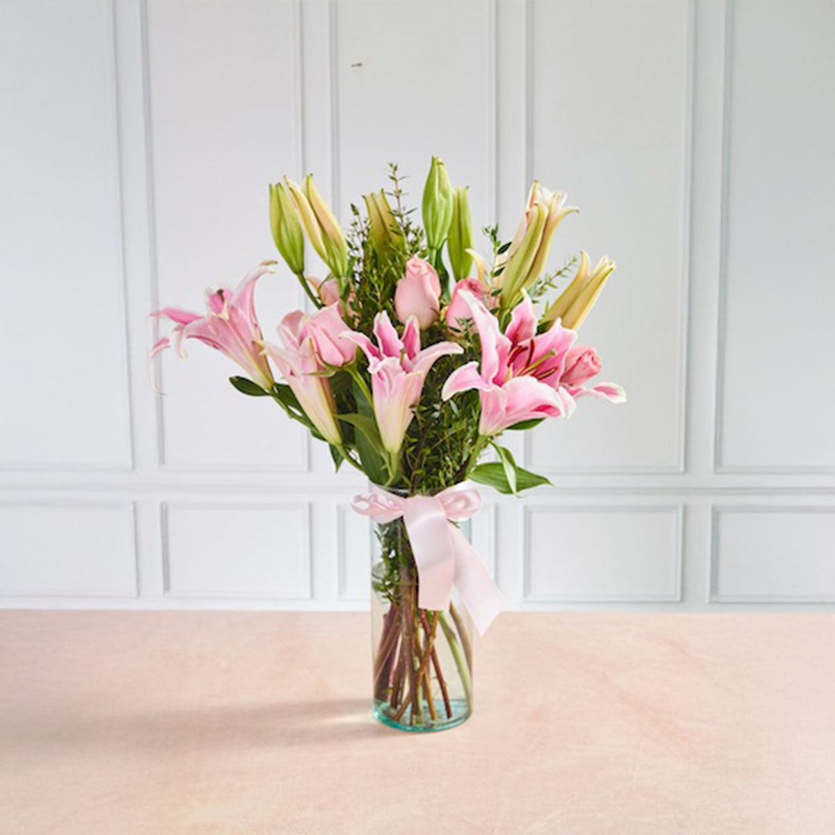 Lirios rosados con fino follaje: Un arreglo elegante y sereno.