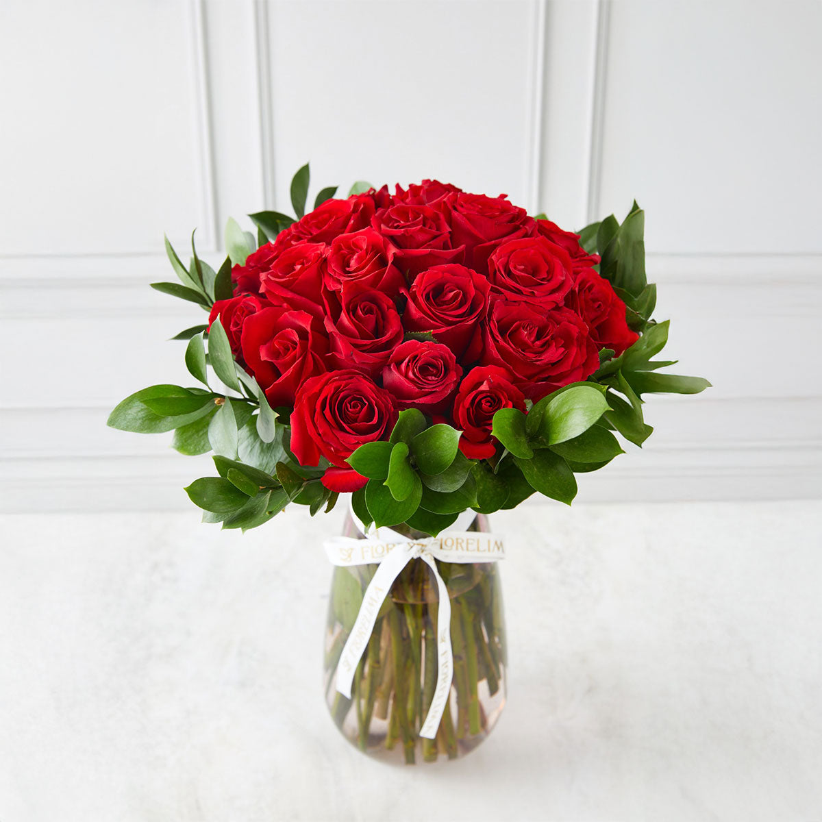 Jarrón de 20cm, ideal para decorar el lugar favorito de mamá. Compuesto por 24 rosas frescas y duraderas.