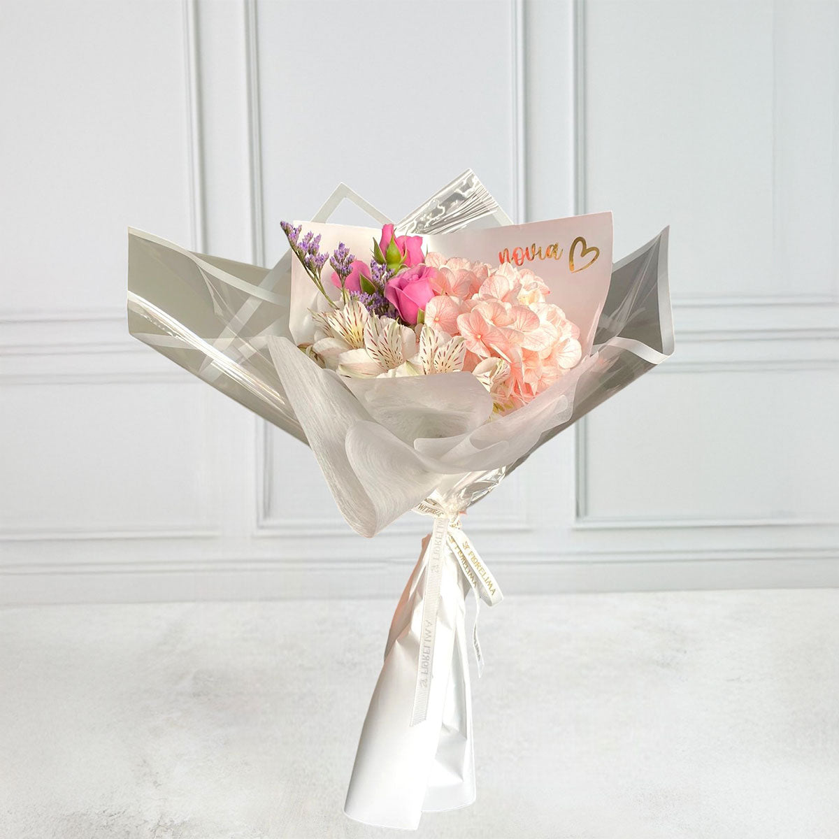 Encantador ramo de Mini Rosas, Hortensia y Astromelias. Un detalle simple pero hermoso.