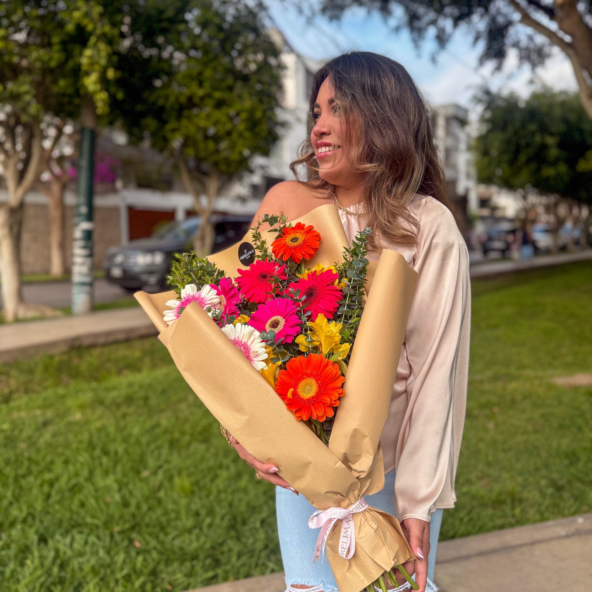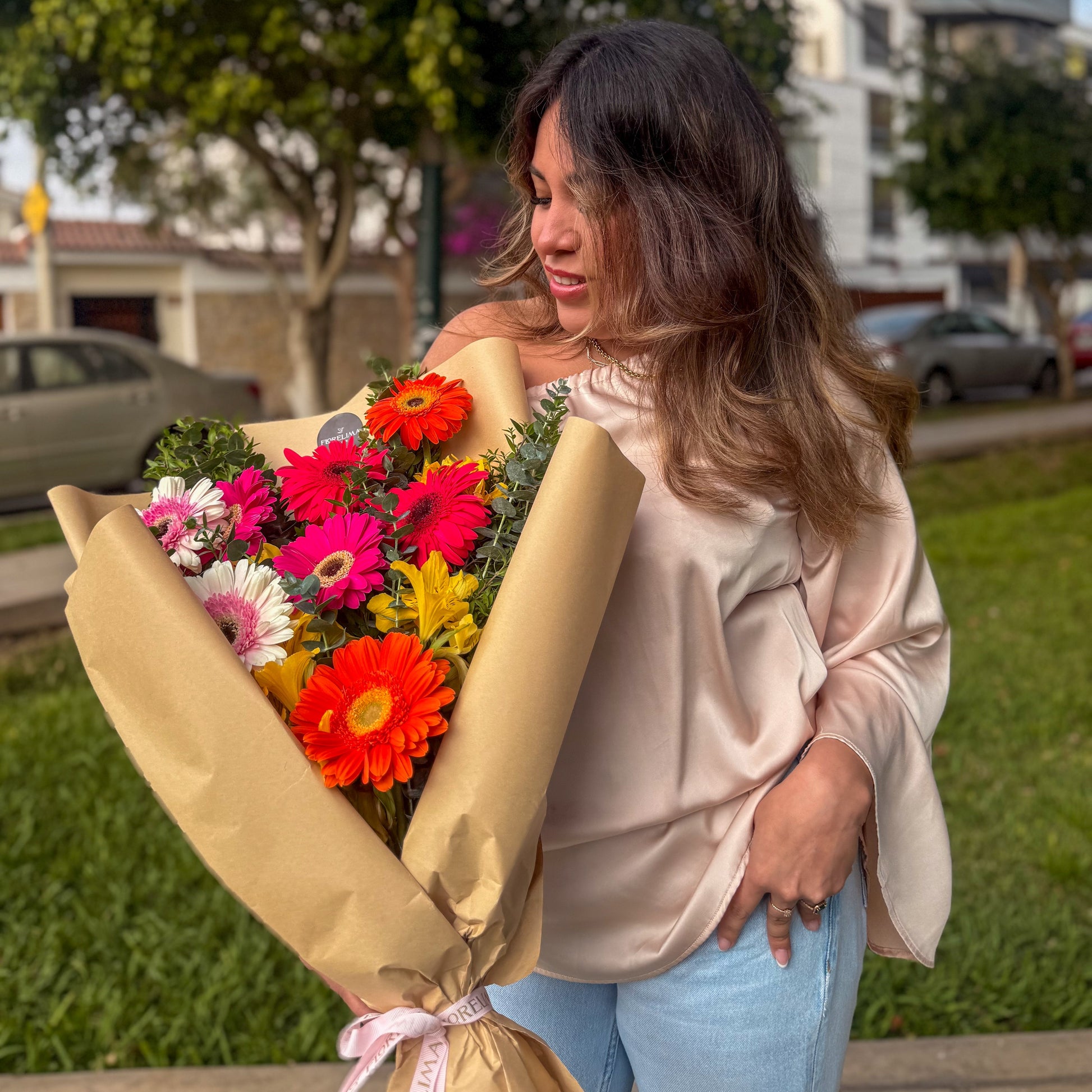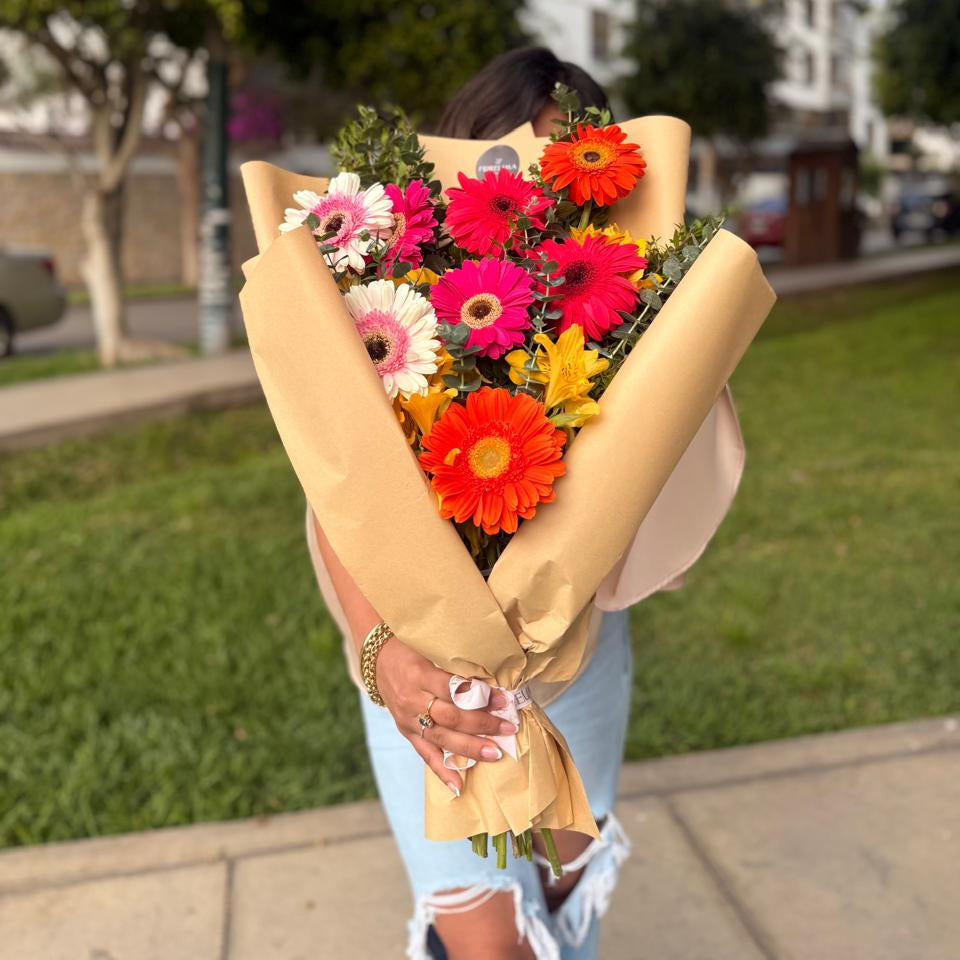 Un arreglo alegre y lleno de vida, compuesto por 8 gerberas frescas en una armoniosa mezcla de colores vibrantes como el rosado, amarillo, rosado, blanco y naranja. Cada flor destaca por su forma perfecta y pétalos radiantes que simbolizan alegría, amistad y energía positiva.
