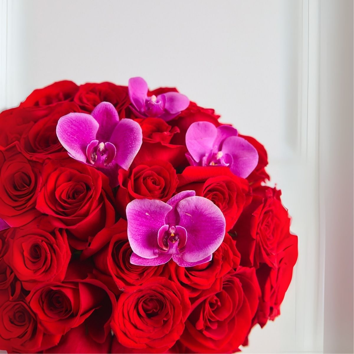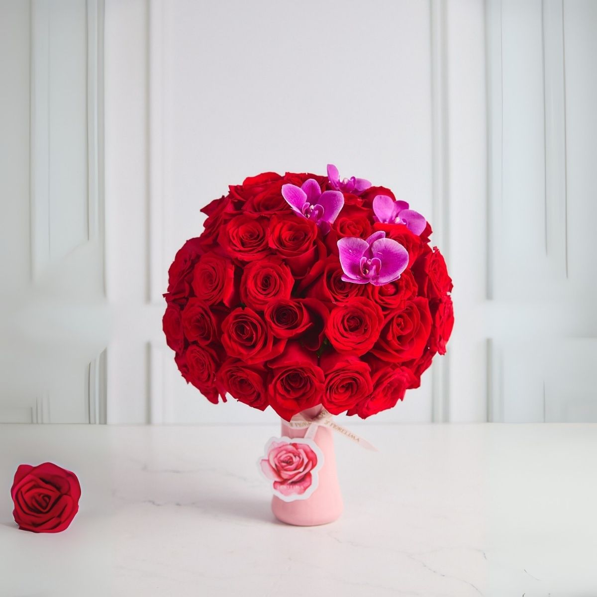 hermoso florero con rosas rojas y orquídeas en forma de un algodón, perfecto para diferentes ocasiones